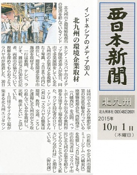 2015年10月02日(金) お知らせ インドネシア共和国・スラバヤ市より、マスメディア関係者31名がご来社されました。 工場で飲料容器分別ラインを視察後、弊社がスラバヤ市で取り組んでいる事業内容についてご説明いたしました。これらの取材を通じて、スラバヤの皆さんに、弊社現地事業への理解が深まることを期待しています。翌日の西日本新聞に取材の様子が掲載されました。