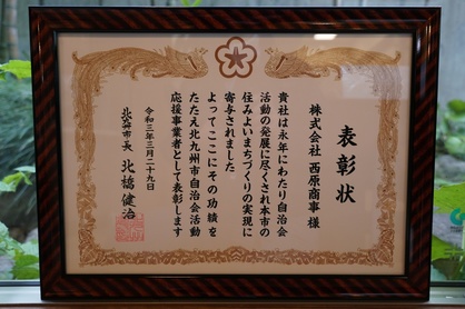 2021年03月29日(月) お知らせ 第1回北九州市自治会活動応援事業者表彰 この度、北九州市より北九州市自治会活動応援事業者表彰を受賞いたしました。 今後とも、地域の皆様と共に、より住みよい地域づくりの実現に努めてまいります。