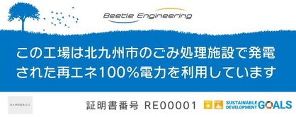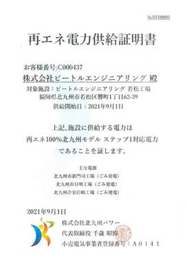 2021年09月01日(水) お知らせ 民間第1号、再エネ電力100% ㈱ビートルエンジニアリング若松工場の使用電力を再エネ100%電力に切り替えました。 市内の民間第1号の『再エネ電力供給証明書』を北九州パワー社より発行頂きました。 来年春稼働の新工場も、同様に導入を予定しています。 脱炭素社会へ向けて、クリーンな電力を活用してまいります。
