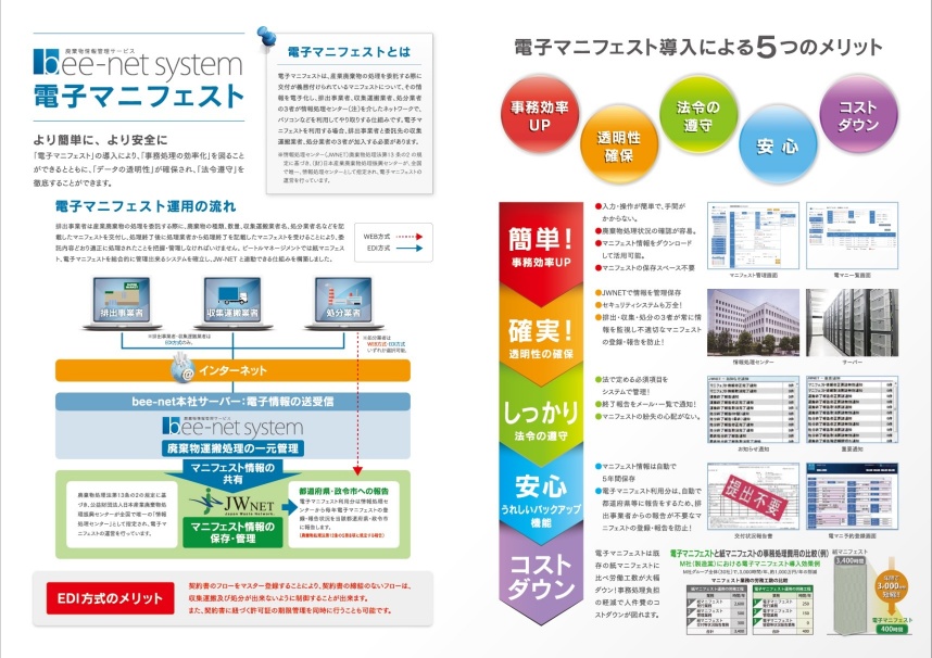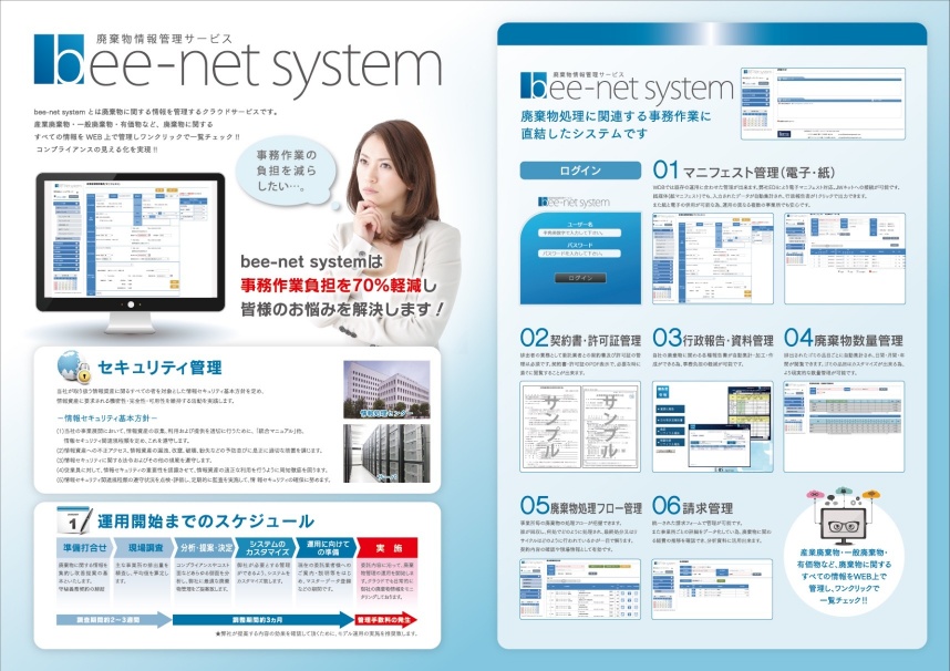 事務代行サービス事業 お客様の廃棄物に関わる事務作業は、複雑で膨大。 その中で法令順守・コスト管理・情報の信憑性が求められます。そんなお客様の問題を解決するために、当社で開発した廃棄物情報管理サービス「bee-netシステム」を用いて、事務作業の効率化を図ります。
